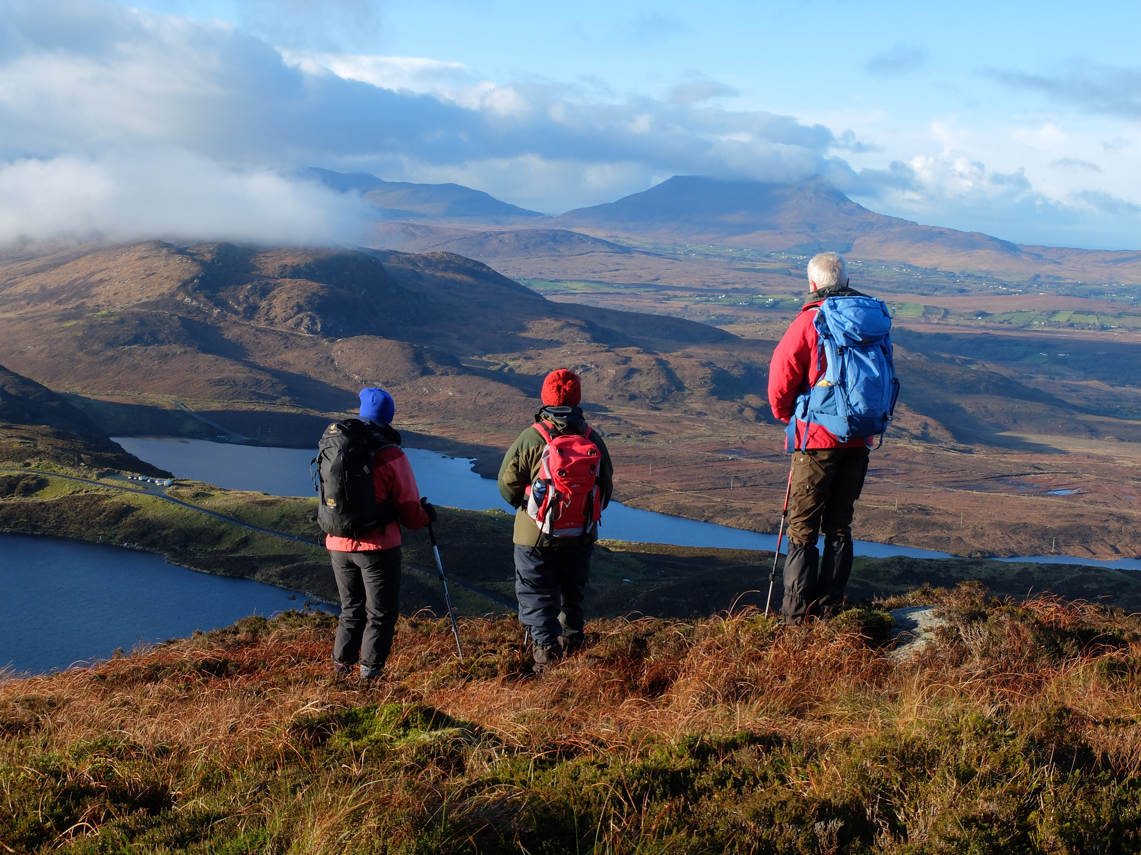 Hill walking is one of the best ways of keeping fit. For strength, nearly all the muscle groups are used, and for aerobic fitness, there is nothing better than walking up a steep mountain incline. The combination of exercise, fresh air, and uplifting views help reduce stress, and are beneficial to mental health. Hill walking can be continued well into old age. Some new walkers may struggle for the first few weeks, but fitness develops, and getting to the top (and going far beyond) almost becomes an addiction. It is a joy to see their expressions when first seeing the spectacular vistas across Ireland’s highlands.