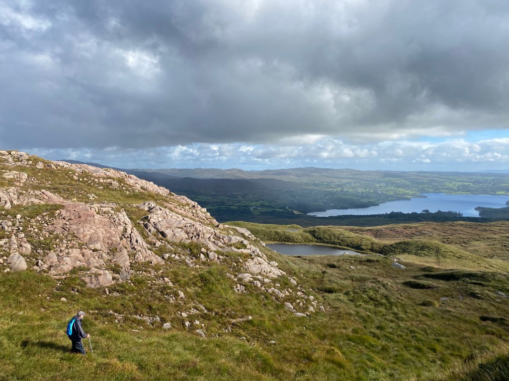 As is usual for the NWMC the group split with two members doing a shorter walk to Banagher hill. The main party of seven walked eastwards towards Lough Belshade. On route there were magnificent views of the Donegal countryside, Lough Eske and away to the west Donegal Bay. We also crossed from a geological area of metamorphic rock to granite. One annoying observation were bamboo sticks with plastic flags attached to indicate an organised walk to the top, these have been there for at least 18months, organisers of such walks should remove them once the walk is complete.