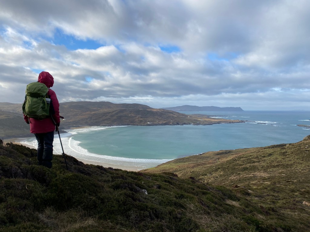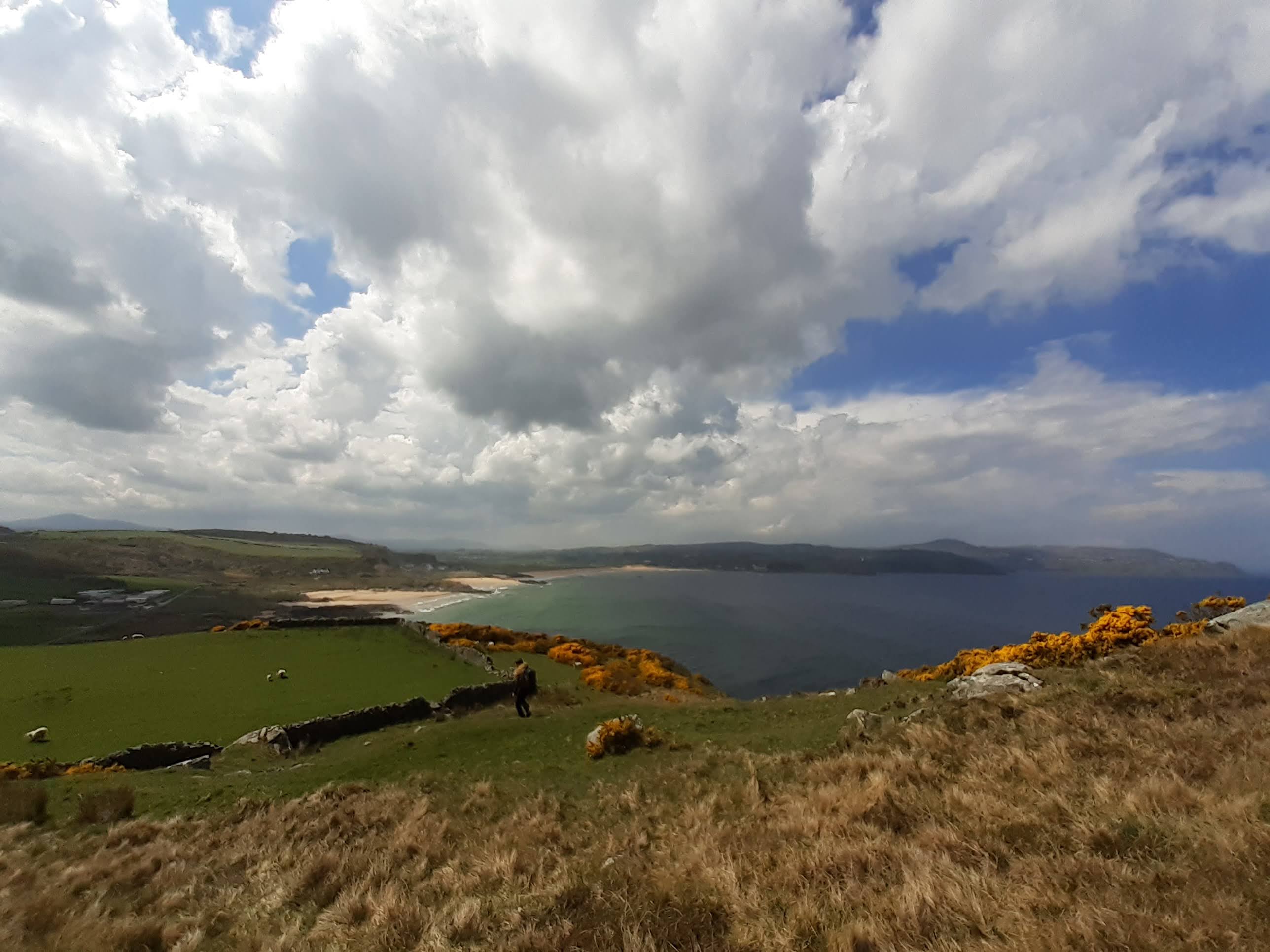 From here we climbed up to Lough Fad and joined the Urris Hills Loop. A way marked path. We returned via Crunlough lake following the track back to the start. A 3.5-4 hr walk in generally good weather. One heavy shower produced a spectacular rainbow over the sea.