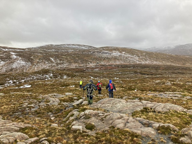 After leaving Billy’s Pit on this cold February morning, eight hardy souls ventured towards Crockmulroney crossing over the Stalkers Path, small streams and the broken deer fence on the way to spot height 430m.
