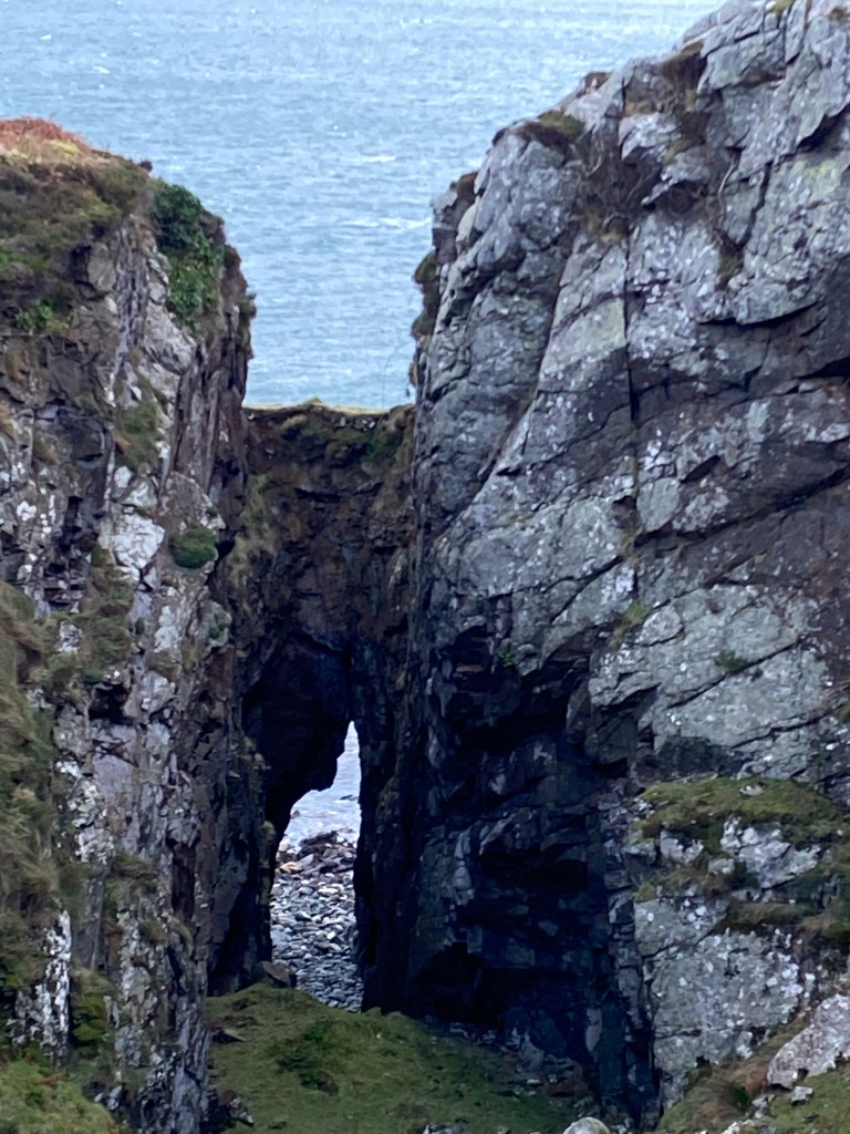 There were 15 walkers, and, delighted to say, the return of some past members. We commenced from the parking area near Lenan beach following the bog road south westwards for about 1km. We then descended to the edge of the sea, skirting the cliff edges marvelling at the rock formations that have been sculpted by the sea. There are sea arches, bridges and undercuts. The sea has tunnelled inland in places some 50-100m eroding the loose rock to form large steep sided holes. There is also a remarkable gorge like feature, with vertical sides some 15-20m deep about 3m wide with a tunnel out to the shoreline.