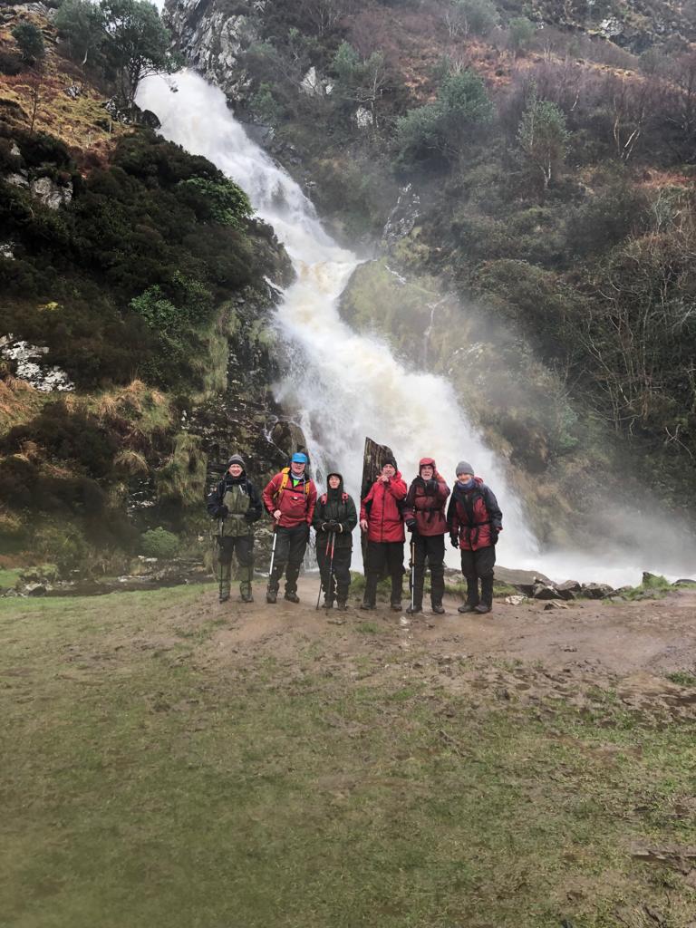 Eleven were on the walk today. Six ventured up Aghla Mountain, 593m, a very steep climb from the starting point by the GAA grounds. A dry day with a S.W. wind, gusting strongly at times clearing the mist to give fine views of Fintown and Lough Finn to the N.E. and the coast to the west. This group split, three continuing to Scraigs, 428m, a craggy mountain due south of Fintown, returning via the track. The other three came down between Aghla and Scaigs visited the waterfall then returned to the cars.