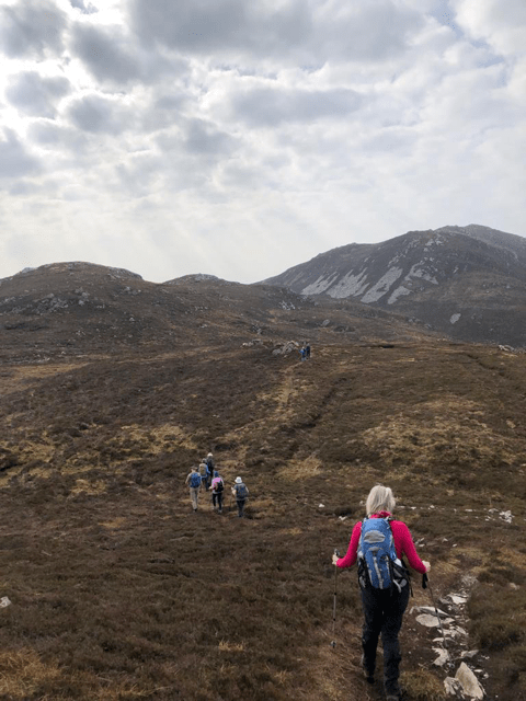 A small group this week again, only six in total. Two opted for a low level walk, four took the usual route. A steep climb up from Páirc Achla (this time we veered toward the gully hoping that the ascent might be easier – it wasn’t!) reaching the summit of Aghla (593m) at 1:15p.m. where we had lunch. We were startled by a grouse as we approached the peak and discovered a nest with nine eggs, hidden in the heather. Our descent brought us past the secret waterfall. We joined the track from Loch Muc below An Cró Cam and met up with the two club members who were on the low level walk. The sun was shining so we found a sheltered spot and stopped for afternoon tea. We returned along the track to An Bheathaidh Mhór and the parked cars. We finished the walk at 4:00p.m.
