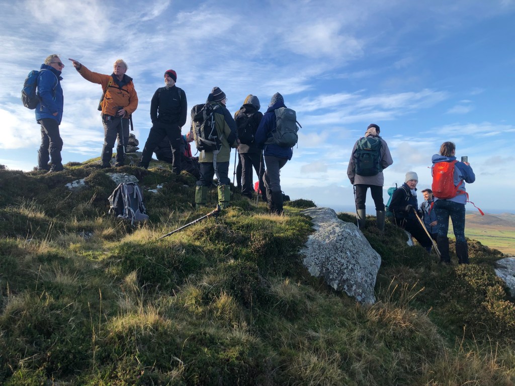 What was forecast to be a fairly wet day, turned out to be sunny, with little wind, and great views. We decided to walk over to the north side of Crummie’s Bay, from where some continued to follow the coast and others chose to take a line between the coast and the gradually rising main ridge, to the north-east. Scrambling over and around rocky outcrops we arrived just above the first (of two) lakes, a good place to stop for lunch. Having being joined by the other party, we continued steeply, up towards the main ridge and then on to the highest point at 417m.