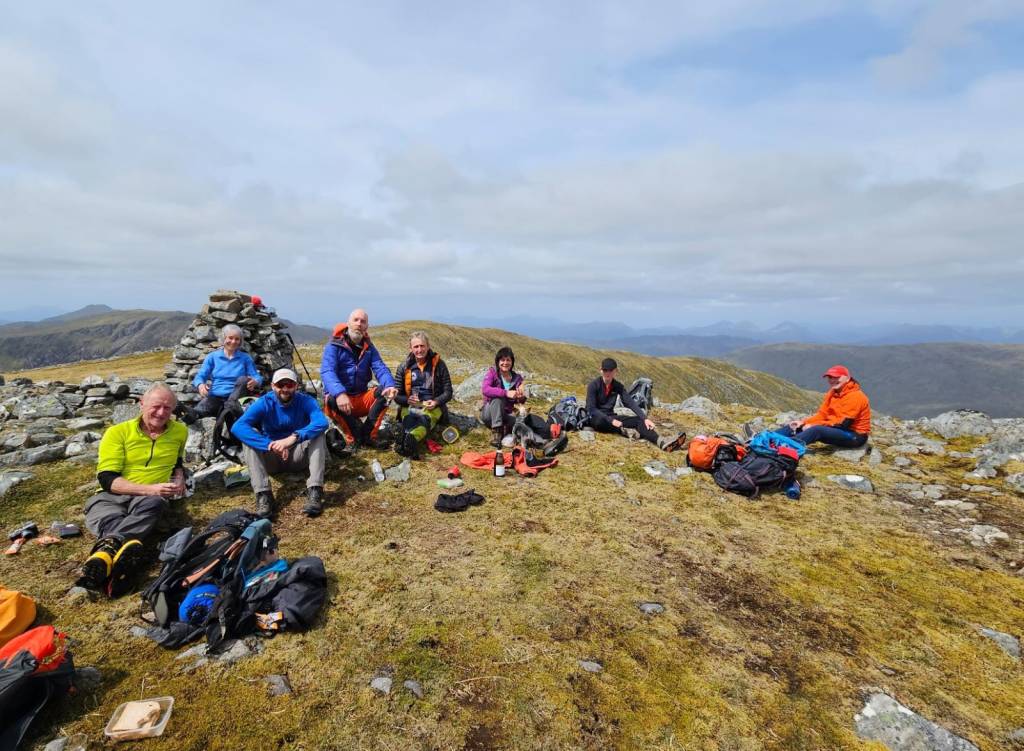 Margaret Tees has climbed her last Corbett, Aonach Buidhe 899m, on 28th of May 2023. This mountain occupies an isolated position at the head of Glen Elchaig, in the centre of the great wilderness that extends from Glen Cannich to Glen Carron. Bikes were used to gain the start which was at Iron Bridge, 13k in. The day was warm, dry and devoid of midges. At the summit the group followed the usual Scottish tradition of quoffing whiskey and wee buns. A great day was enjoyed by all.